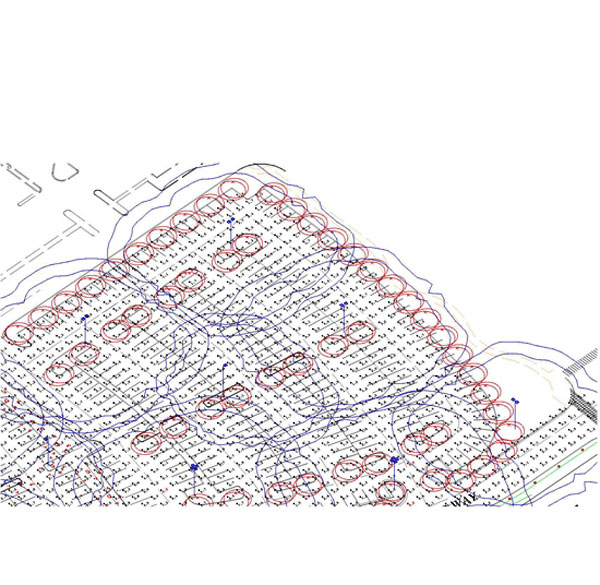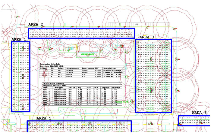 Example one is a typical parking layout with point by point calculations for light levels inside the parking areas. In this example the areas are segregated by the owner’s request and analyzed independently. The red lines show lighting patterns produced by the existing fixtures and demonstrate wasted light that is cast off the site.