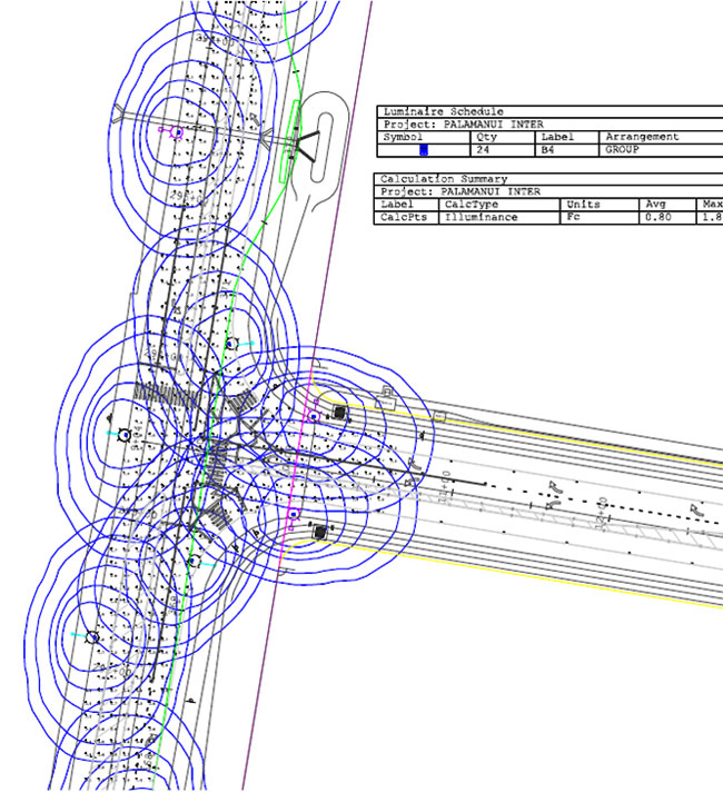 Lighting analysis for roadways may be determined for intersections and driving lanes. Patterns of light produced by pole lights are definable for design considerations and light produced by the fixtures can be measured anywhere in the project area.