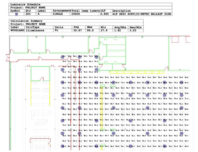 This example represents a typical plan view of a building layout – only a portion of the building being shown for this example - with point by point calculations of illumination levels and statistical information gathered from the entire building interior.